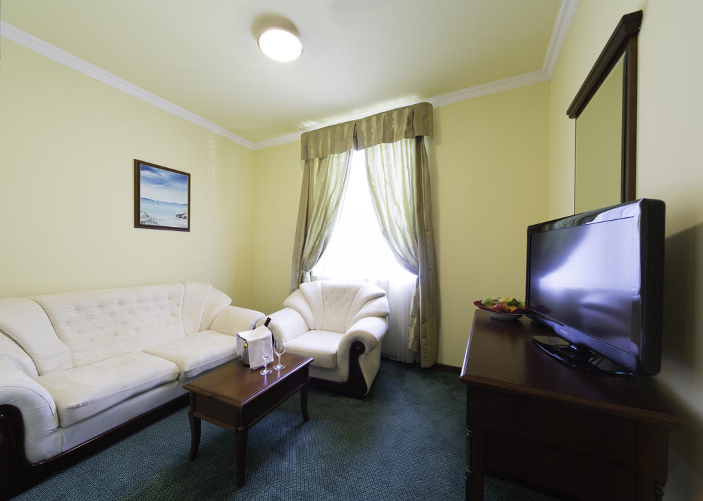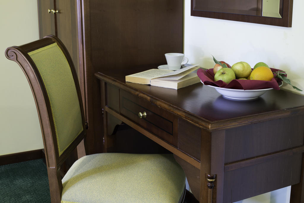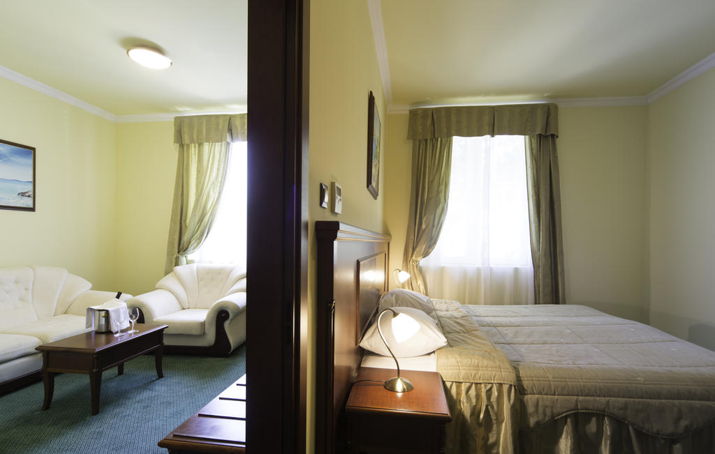 The rooms and suites are equipped with comfortable beds, elegant wooden furniture, and walls decorated with unique paintings of Mediterranean motifs. Room facilities include hydro-massage showers.